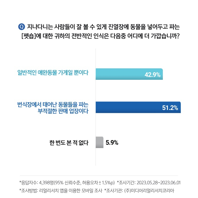 리서치 전문 기업 리얼리서치코리아가 5월 28일부터 6월 1일까지 대한민국 성인남녀 4,398명을 대상으로 펫숍 인식에 대해 설문조사를 실시했다. 결과에 따르면 펫숍에 대한 인식을 묻는 질문에 '번식장에서 태어난 동물들을 파는 부적절한 판매 업장이다'라는 응답이 51.2%로 나타났다.