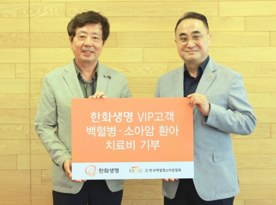 한화생명이 한국백혈병소아암협회와 함께 28일 서울 여의도 63빌딩 FA센터에서 '2023 한화생명 VIP 고객 서비스 기부금 전달식'을 열었다.