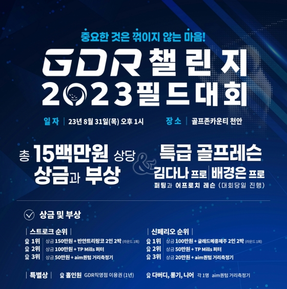 한편, 골프 레슨의 표준화와 대중성을 표방하는 골프존 GDR아카데미가 진행하는 'GDR 챌린지 2023 필드대회' 참가문의 및 대회 요강, 관련 상세 정보는 카카오톡 채널, 유선 문의, GDR아카데미 공식 홈페이지를 통해 확인 가능하다.