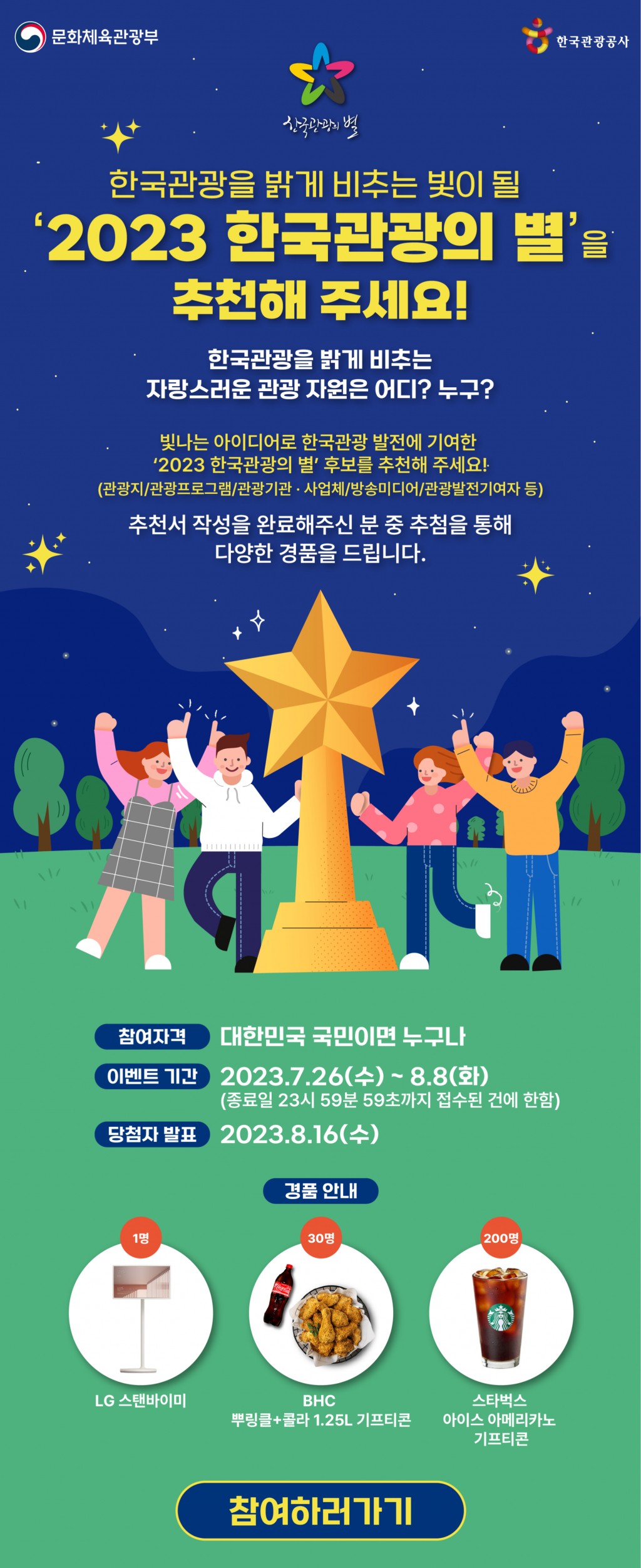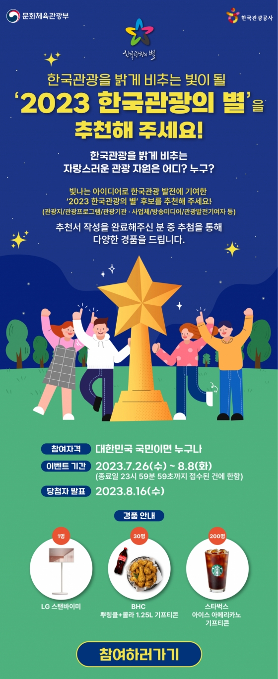 문화체육관광부와 한국관광공사(이하 공사)는 7월 26일(수)부터 8월 8일(화)까지 '2023 한국관광의 별' 후보 추천 이벤트를 진행한다.