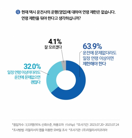 리서치 전문 기업 리얼리서치코리아가 7월 20일부터 24일까지 대한민국 성인남녀 3,531명을 대상으로 택시 운전자 연령 제한에 대한 설문조사를 실시했다. 결과에 따르면 택시기사의 연령대 제한에 대해 의견을 묻는 질문에 응답자의 과반수 이상인 63.9%가 '운전에 문제가 없더라도 일정 연령 이상이면 제한해야 한다'고 답한 것으로 나타났다.
