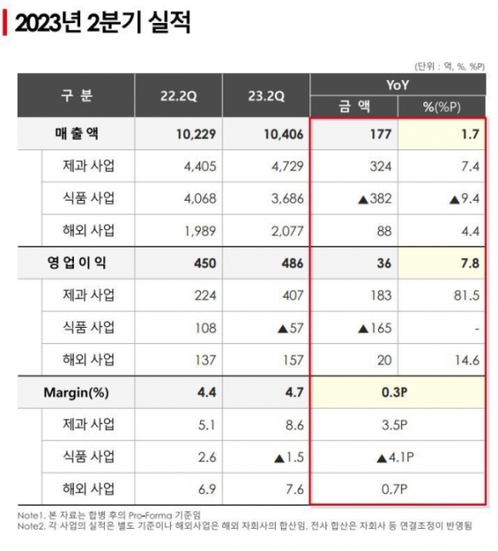 부문별 매출은 제과 사업 4729억원, 식품 사업 3686억원, 해외 사업 2077억원으로 각각 집계됐다. 영업이익은 제과 사업 407억원, 해외 사업 157억원이었고 식품 사업에선 57억원 적자를 기록했다.