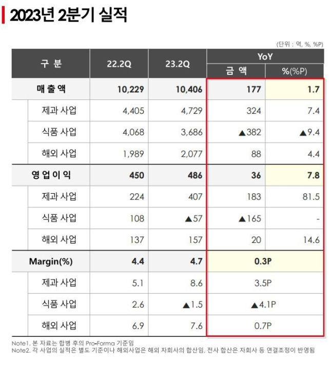 식품 사업 매출은 전년동기 대비 9.4% 감소했고, 56억원의 손실을 기록했다. 리오프닝 영향으로 B2C(기업과 소비자간 거래) 적자는 축소됐지만 쇼트닝 등 업소에 납품하는 유지류 매출이 전년동기 대비 28.6% 감소하면서 수익성이 악화됐다는 설명이다.