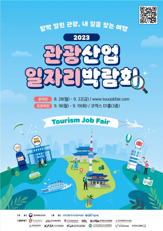 문화체육관광부와 한국관광공사(이하 공사)는 한국호텔업협회, 한국관광협회중앙회 등 관광 유관 학회·협회와 함께 '2023 관광산업 일자리박람회'를 개최한다. 8월 28일부터 9월 22일까지 관광산업 일자리박람회 누리집(www.tourjobfair.com)에서 온라인으로 진행되며, 9월 18일부터 19일까지는 서울 코엑스에서 오프라인으로 진행된다.