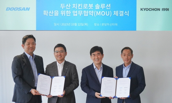 교촌에프앤비가 두산로보틱스와 '치킨로봇 솔루션 확산'을 위한 업무협약(MOU)을 맺고, IT 서비스 혁신을 통한 매장 효율화를 가속화한다.
