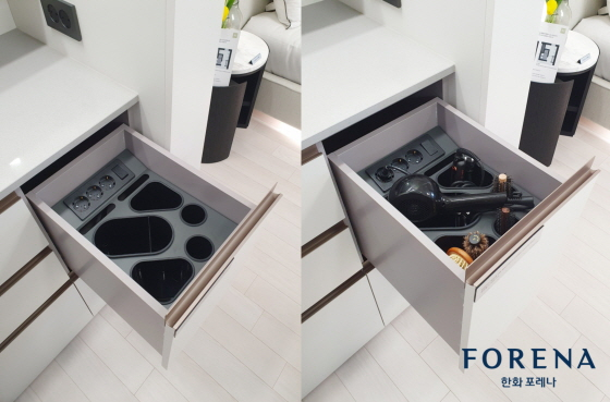 2023 우수디자인에 선정된 한화 건설부문의 '포레나 헤어 드라이기 수납시스템'은 헤어드라이기, 고데기, 브러쉬 등 헤어 제품 보관에 특화된 디자인 수납시스템이다.