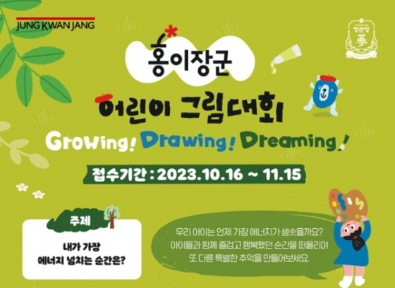 한편, KGC인삼공사는 홍이장군 리뉴얼을 맞아 어린이 그림 대회를 개최하고 오는 11월 15일까지 이벤트 페이지를 통해 작품을 공모한다. 만 3세~9세 어린이라면 누구나 참여 가능하다. 즐겁고 행복한 에너지가 넘치는 순간을 그림으로 표현하는 응모 주제에 맞춰 8절 도화지 규격에 창작한 작품 사진을 찍고, 그림을 그리는 모습을 사진으로 찍어 응모 페이지에 제출하면 된다. 심사 결과는 12월에 발표한다.