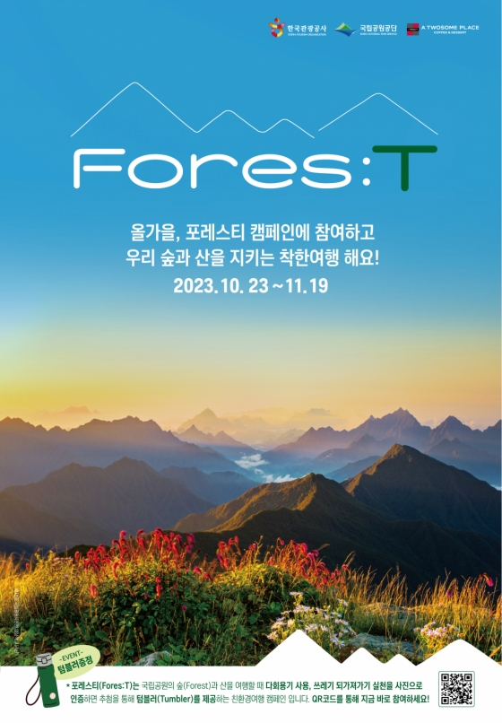 한국관광공사(이하 공사)는 10월 23일부터 11월 19일까지 국립공원공단 및 투썸플레이스와 공동으로 가을 성수기 등산객 대상 친환경 여행 실천을 촉진하는 '포레스티(Fores:T) 캠페인'을 실시한다.
