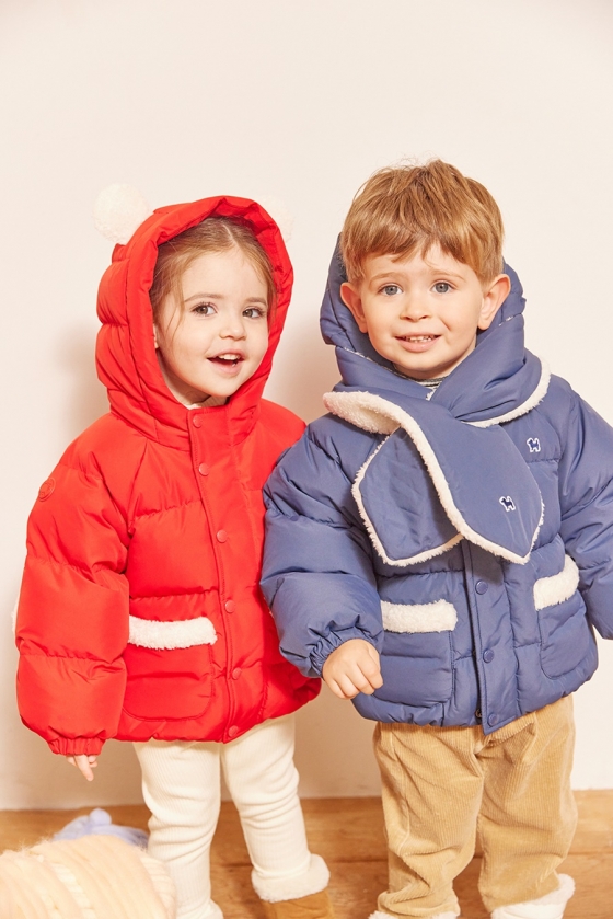 'RDS큐티컬러다운점퍼'는 RDS 인증을 받은 컬러 다운 점퍼로 숏한 기장감을 통해 트렌디한느낌을 연출할 수 있다. 이와 함께 후드 부분에는 착용시 아이들의 귀여움을 한층 더 살려줄 수 있는 귀장식으로 포인트를 더했다. 겨울철 따뜻함을 더해줄 목도리 세트는 아우터와 분리하여 입을 수 있도록 활용성을 높였다.