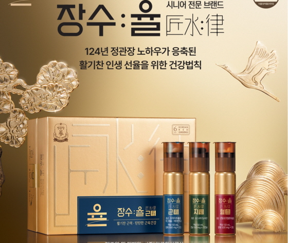'장수:율(匠水:律)'은 70세 이후 급격하게 건강이슈가 발생하는 시니어 뿐만 아니라, 사회활동에 활발히 참여하는 '액티브 시니어'까지 공략하며 지난 9월 '장수:율 지(知)' 출시를 시작으로 정관장이 새롭게 런칭한 브랜드다.