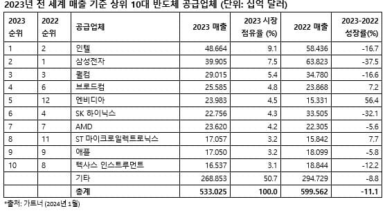 인텔은 지난해 486억6천400만 달러의 매출로 전년(584억3천600 만달러) 보다 16.7% 줄었지만, 삼성보다 적은 감소폭으로 인해 1위를 탈환할 수 있었다. 인텔이 1위를 기록한 것은 2021년 이후 2년 만이다.