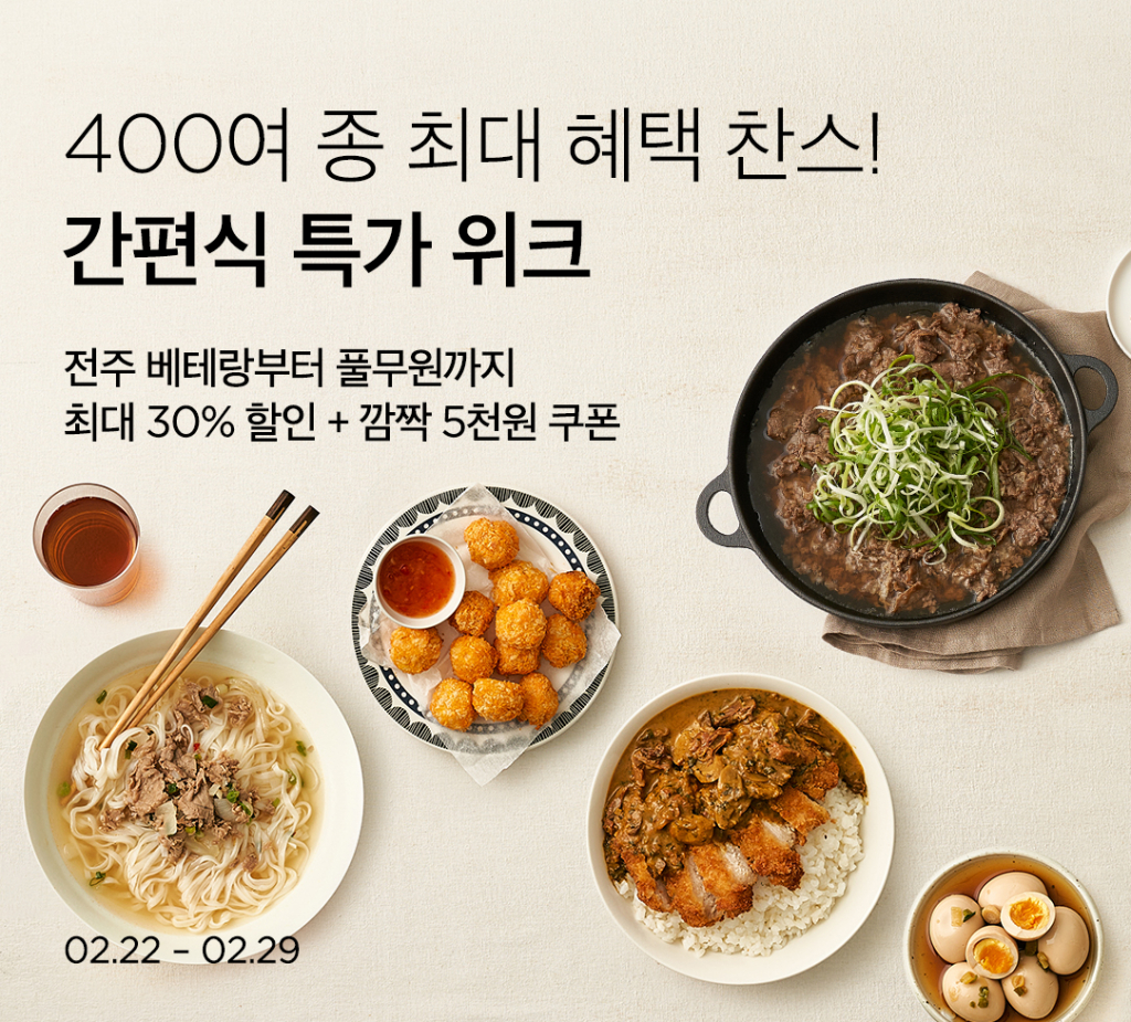 29일까지 진행되는 이번 기획전에서는 풀무원, 굽네, 신세계푸드 등 장바구니 단골 브랜드부터 전주 베테랑, 미아논나, 강남면옥 등 오프라인 인기 맛집까지 400여개 상품을 최대 30% 할인 판매한다. 깜짝 5,000원 쿠폰도 준비해 혜택을 더했다.