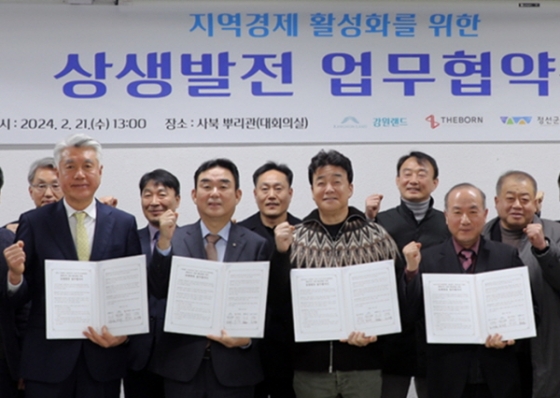 강원랜드가 21일 폐광지역 경제 활성화라는 설립목적을 달성하기 위해 더본코리아, 정선군, 대중소기업농어업협력재단과 '지역경제 활성화를 위한 상생발전 업무협약'을 체결했다.