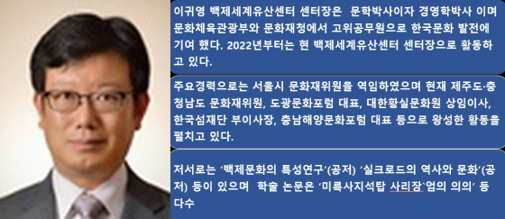 백제는 사라졌으나 그 문화의 생명은 영속성을 띠고 확대 재산상 중이다. 이러한 문화를 간직하고, 가꾸어 키워나가고, 창조의 자원으로서 활용해 온 것이 우리 선조들과 선배들과 우리들이 해 온 역할이며, 앞으로 후배들과 함께할 사명이기도 하다. 유산이 말그대로 과거의 것으로 넘을 것인지, 아니면 미래의 위대한 자원이 될 것인지 하는 것은, 지금 우리가 어떻게 하는 가에 달려 있기 때문이다.