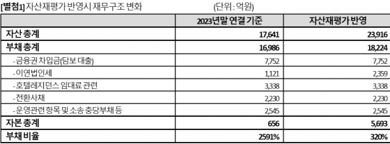 이와 함께 2,591%에 이르던 부채비율도 이번 재산재평가로 320%로 급감하게 됐다. 이연법인세 증가로 기존 총부채가 1조6,986억원(2023년말 연결기준)에서 1조8,224억원으로 늘어나지만 656억원이던 자기자본이 5,693억원으로 급증했기 때문이다.