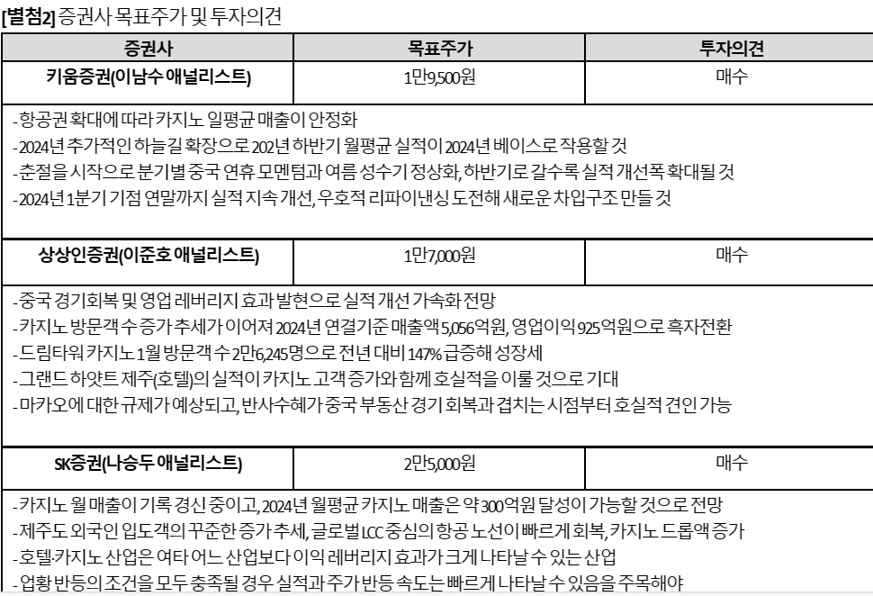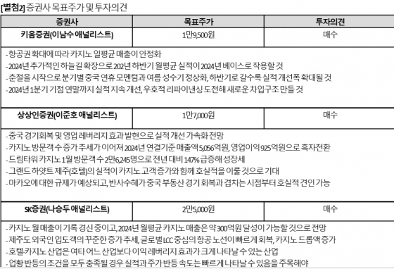 이와 관련, SK증권과 키움증권은 올해 실적 개선을 통한 확실한 흑자전환을 예상하면서 롯데관광개발의 목표주가를 각각 2만5,000원과 1만9,500원으로, 투자의견은 공히 '매수(BUY)' 를 제시하고 있다.