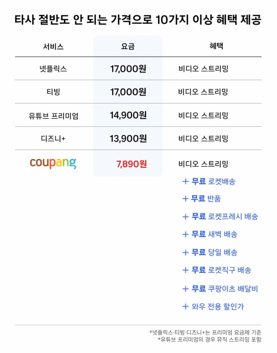 ◇ 국내 주요 OTT 멤버십 서비스 대비 '반값' 이하 요금...쿠팡이츠 무료 음식배달·쿠팡플레이 독점 콘텐츠 확대