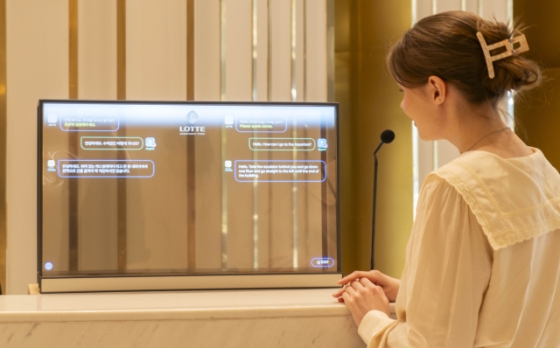 에비뉴엘 잠실점 1층과 롯데월드몰 지하 1층 안내데스크에 설치된 ‘트랜스 토커’를 외국인 모델이 활용하고 있는 모습.