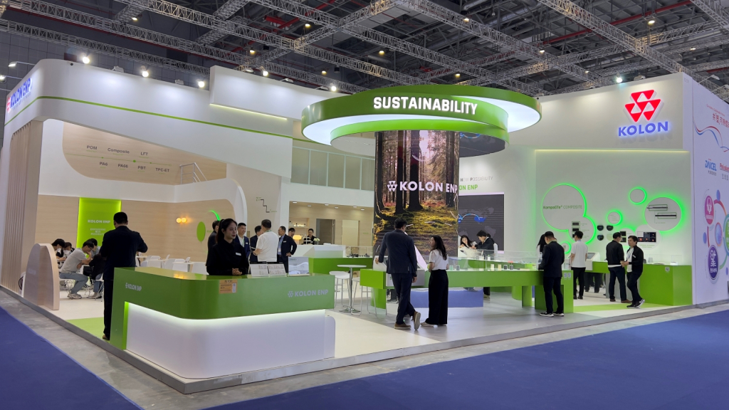 차이나플라스 2024 코오롱ENP 부스는 '지속가능성(Sustainability)'을 메인 테마로 꾸며졌다. 부스에는 친환경 소재, 차세대 모빌리티용 핵심소재, 복합소재 등 엔지니어링플라스틱 제품군 5종('PA & PBT', 'POM', 'TPC-ET', 'KompoGTe®)이 전시됐다.