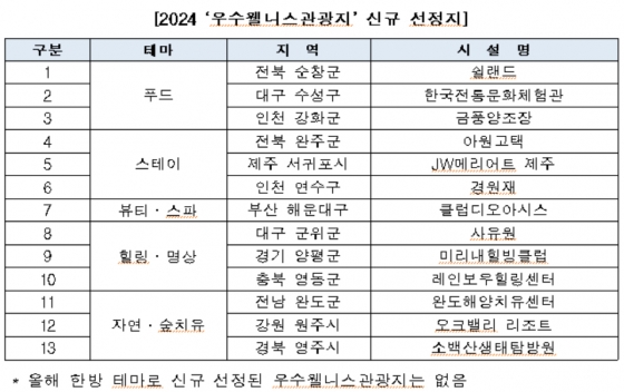 문화체육관광부(이하 문체부)와 한국관광공사(이하 공사)는 한국의 아름다운 풍경과 특별한 경험이 어우러진 곳, 우리의 몸과 마음이 치유되는 경험을 선사할 신규 우수웰니스관광지 13개소를 선정, 발표했다.