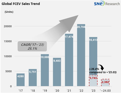 SNE리서치는 "국내 시장에서 소비자가 선택할 수 있는 선택지는 2018년에 출시한 현대차 넥쏘가 유일하지만, 차세대 모델 출시마저 계속 미뤄지고 있다"며 "수소차의 연료전지 내구성 문제는 해결되지 않고 수소 충전 인프라 부족, 불량 수소 사고, 충전 비용 상승 등의 악재가 겹쳐 친환경차 시장에서 외면받고 있다"고 했다.
