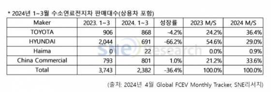 13일 시장조사업체 SNE리서치에 따르면 올해 1~3월 각 국에 등록된 수소연료전지차의 총판매량은 2382대로 전년 동기(3743대) 대비 36.4% 감소했다. 수소차 시장은 지난 2022년(1분기 판매량 2만704대)을 정점으로 2년 연속 판매량이 급감하며 쪼그라들고 있다.