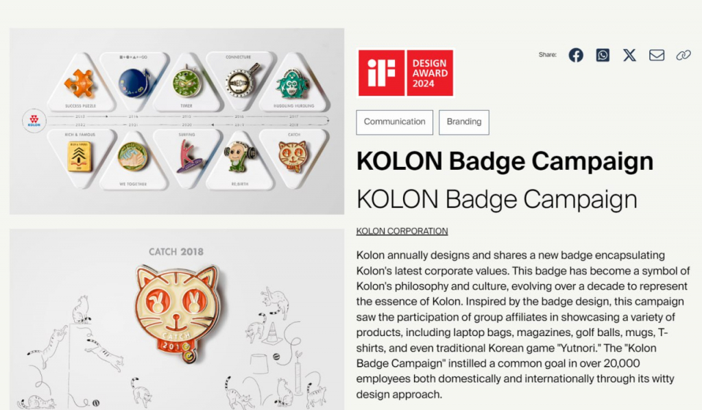 iF는 수상을 선정하며 "코오롱은 매년 최신의 기업가치를 담아 재치있는 디자인 접근 방식으로 국내외 임직원들에게 공통의 목표를 효과적으로 심어주고 있다"고 평가했다.