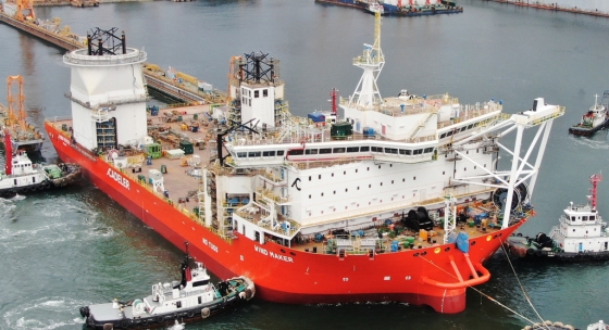 이번에 진수한 대형 WTIV는 지난 2021년 카델라로부터 수주했다. 길이 148m 폭 56m 규모 설비로, 15MW급 대형 해상풍력발전기 5기를 한 번에 실을 수 있는 해상풍력발전기 설치선이다. 수심 65m까지 발전기 설치가 가능하다.