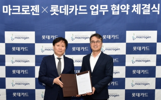 이번 협약식은 서울 종로구 롯데카드 본사에서 마크로젠 김종윤 개인지놈사업본부장, 롯데카드 한정욱 Digi-LOCA(디지로카)본부장 등 양측 관계자가 참석한 가운데 진행됐다.