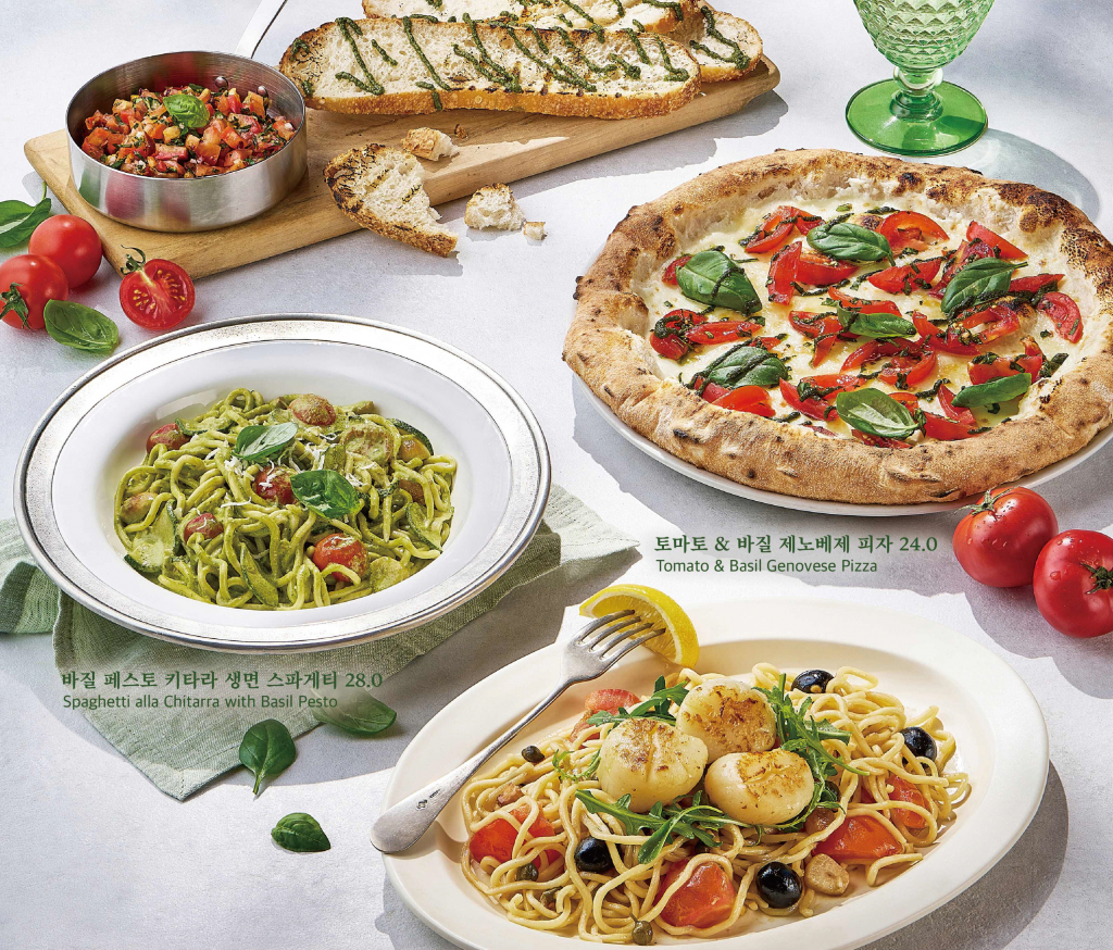 이번에 새롭게 선보이는 신메뉴는 '토마토 & 바질 제노베제 피자', '바질 페스토 키타라 생면 스파게티', '바질 페스토 뇨끼', '관자 엔초비 알리오 올리오 키타라 생면 스파게티', '엔초비 알리오 올리오 스파게티', '토마토 & 바질 부르스게타', '토마토 & 바질 부라타 샐러드' 7종이며, '제철 식재료와 함께하는 나폴리의 사계(四季)'를 주제로 싱그러운 여름 제철 식재료 토마토와 바질을 활용한 것이 특징이다.