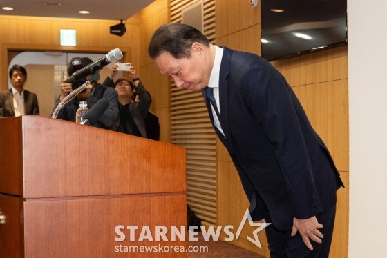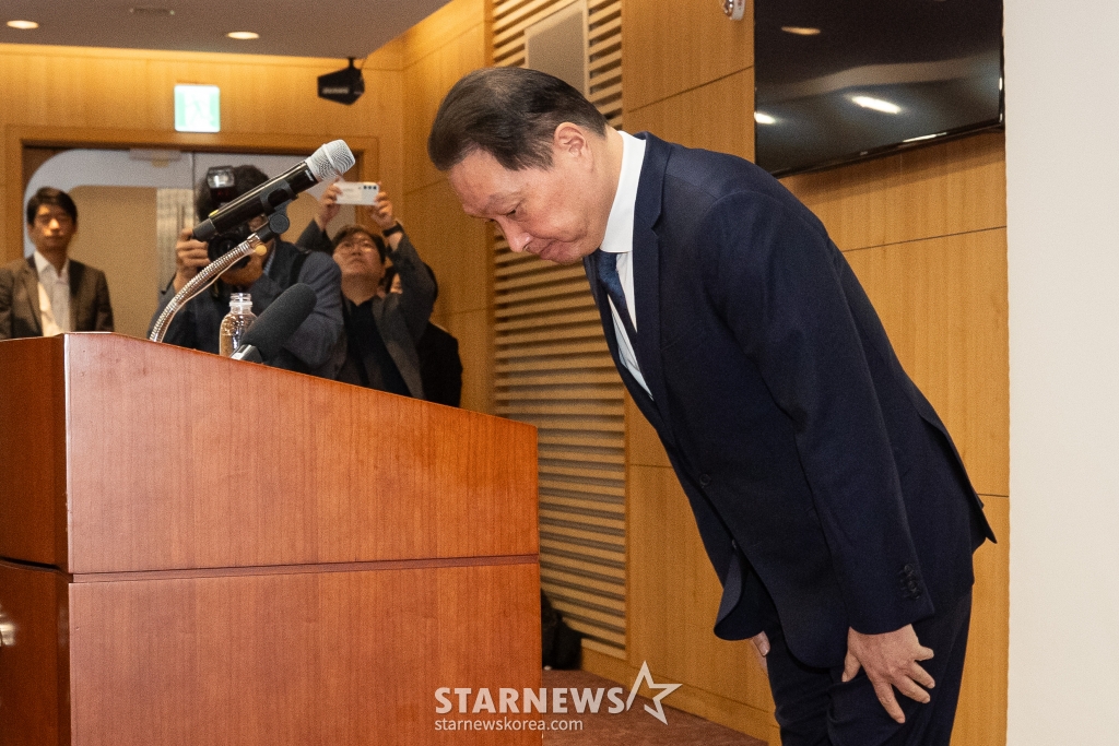 최 회장은 이혼소송과 관련해 직접 사과하며 두 차례 허리를 숙인 '폴더인사'를 했다.