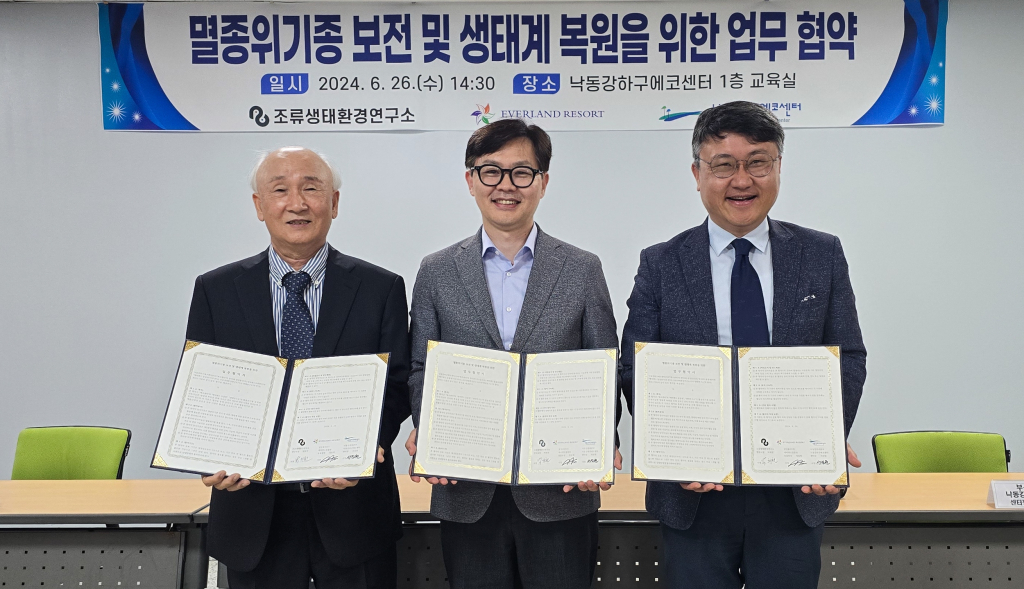 26일 낙동강하구에코센터에서 에버랜드 정동희 주토피아팀장(동물원장), 낙동강하구에코센터 서진원 센터장, 조류생태환경연구소 박희천 소장 등 3개 기관 10여명이 참석한 가운데 「멸종위기종 보전 및 생태계 복원 업무협약」을 맺고, 큰고니 야생 방사 프로젝트와 더불어 국내 멸종위기종 보전을 위한 상호 협력을 추진하기로 했다.