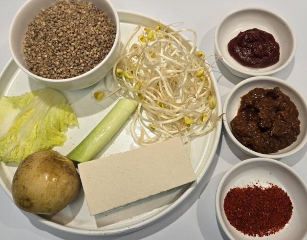 메밀찐쌀 350g, 고추장 4큰 술, 된장 1큰 술(또는 막장), 감자 반개,