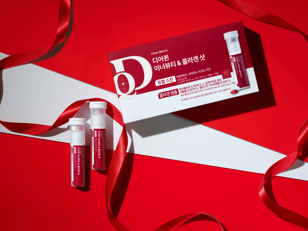 먼저 '디어퀸 이너뷰티&콜라겐샷'은 건강기능식품과 일반식품을 함께 섭취할 수 있는 식약처 규제특례 융복합 건강기능식품이다. 제품 상단에는 캡슐형 히알루론산과 정제형 비오틴, 비타민A, 아연이 있고, 하단 바이알에는 GT콜라겐과 엘라스틴, 글루타치온이 함유된 오렌지맛의 액상 콜라겐 앰플로 구성됐다. 피부 관리와 동시에 활력 에너지를 간편하게 채우고 싶은 이들에게 적합하다.