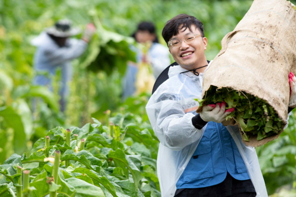 KT&G가 일손 부족으로 어려움을 겪는 잎담배 농가를 돕기 위해 잎담배 수확 봉사활동을 지난 19일 진행했다.