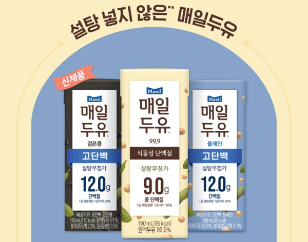 지난 6월에는 설탕을 넣지 않고, 당 함량 1g대로 부담 없이 마실 수 있는 고단백 두유 '매일두유 고단백 검은콩'을 신제품으로 출시했다. '매일두유 고단백 검은콩'은 건강한 단맛을 구현한 기존 '매일두유 검은콩' 제품에서 한층 더 단백질 함량은 높이고, 당 함량은 낮추는 영양설계로 당 섭취를 줄이고 싶은 사람들을 위해 선보인 제품이다. 특히 설탕무첨가가 특징으로 천연 감미료인 알룰로오스와 스테비올배당체를 사용해 당류가 1.7g으로, 190mL 용량 한 팩을 마셔도 당 함량이 1g 대 수준이다. 또한 콩 단백질 함량이 12g인 고단백 제품으로, 달걀 약 2개 분량 수준의 식물성 단백질을 섭취할 수 있다.