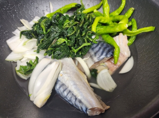 3. 냄비에 들기름을 두르고 곤드레, 고등어를 순서대로 올린다.