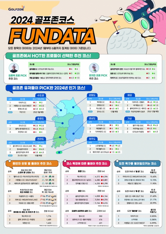 2024 펀데이터는 △인기프로가 선택한 추천코스, △지역별 유저 인기코스, △동반자 유형 별 플레이 추천코스, △코스 특징에 따른 플레이 추천 코스, △도전 욕구를 불러일으키는 코스까지 총 5개 카테고리로 구성됐다. '인기프로 추천코스'로는 필드와 스크린에서 맹활약 중인 김홍택, GTOUR WOMEN'S에서 왕성한 활동 중인 한지민 프로가 추천하는 세 가지 코스를 만나볼 수 있다. 김홍택은 GTOUR 대회 우승을 한 '골프클럽Q', 22언더로 자신의 라베 코스인 '원더클럽 알펜시아 700', 장타자에게 유리한 코스로 '콕힐 골프클럽-No.4'를 추천했다.