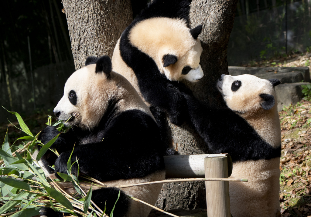 완연한 가을 날씨를 보인 10월 3일 오전, 용인 에버랜드에서 쌍둥이 아기 판다 루이바오, 후이바오가 엄마 아이바오와 함께 야외 나들이를 즐기고 있다.