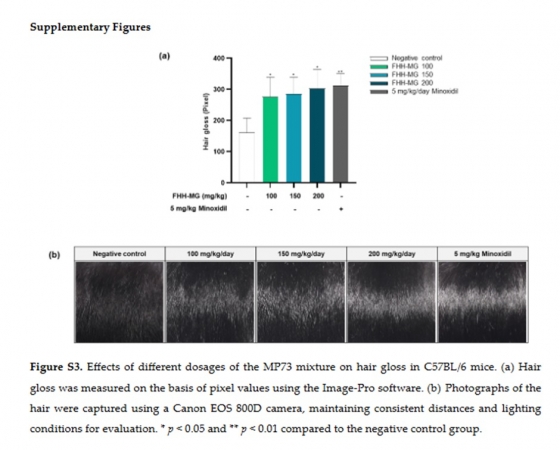 이번 연구를 통해 매스틱검 등 복합물에 의해 모유두세포의 증식을 촉진하고 모발 성장 자극인자인 혈관내피 성장인자(VEGF), IGF-1, β-catenin의 발현을 증가시켰으며, 항산화 효과 및 염증성 사이토카인 억제 효과를 확인했다. 동물실험에서는 모발성장지수(hair growth score)가 증가했으며, 모발의 성장기 비율 상승 및 모발 윤기와 두께가 증가한 것을 확인하였다.