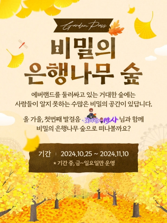 삼성물산 리조트부문(사장 정해린) 에버랜드는 가을 시즌을 맞아 '비밀의 은행나무숲 산책' 프로그램을 새롭게 론칭하고 오는 18일부터 선착순 모집 접수를 시작한다.