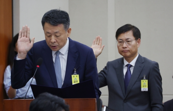 김광일(왼쪽) MBK 파트너스 부회장과 강동수 SK이노베이션 부사장이 지난 17일 서울 여의도 국회에서 열린 정무위원회의 금융감독원, 서민금융진흥원에 대한 국정감사에 증인으로 출석해 선서를 하고 있다. /사진제공=뉴시스