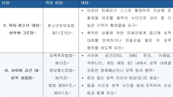 마지막으로 '사이버 공간 내 성적 괴롬힘'이다. 이 유형에는 통신매체를 이용한 음란행위죄(이른바 통매음), 명예훼손죄, 모욕죄가 포함된다.