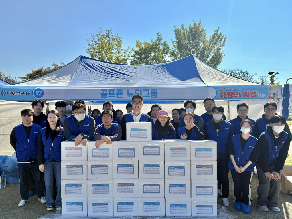 골프존뉴딘그룹(회장 김영찬) 임직원들이 7일 대전 유성구 유림공원에서 열린 '2024 유성구 사랑의 김장 나누기' 자원봉사에 참여하며 지역사회에 온기를 전달했다.