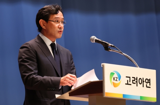 최윤범 고려아연 회장이 최근 '일반공모 유상증자 계획 철회' 등의 내용을 포함한 기자회견문을 낭독하고 있는 모습. /사진제공=뉴시스