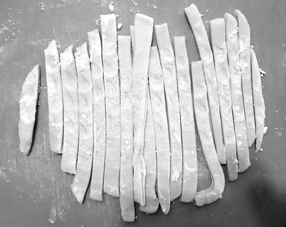 3. 메밀 반죽을 밀어 넓게 펴주고 약 0.5~0.7cm 정도로 채 썬다.