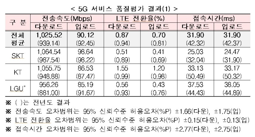이통 3사 전국 평균 5G 다운로드 전송속도는 1025.52Mbps로 전년보다 9.2% 빨라졌다. 전국 5G 평균속도가 1Gbps를 넘은 것은 이번이 처음이다. 통신사별로 SK텔레콤 1064.54Mbps, KT 1055.75Mbps, LG유플러스 956.26Mbps로 집계됐다.
