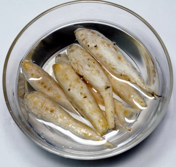 2. 연한 소금물에 담가 더덕의 쓴 맛을 뺀 다음 방망이로 가볍게 두드 려 얇게 편다.