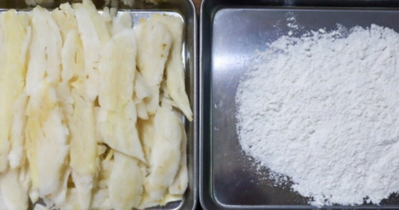 3. 찹쌀가루를 더덕 전체에 고루 묻힌다.