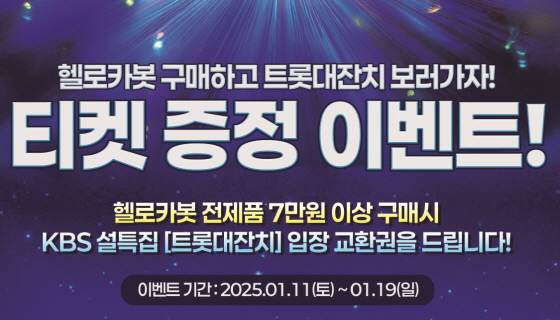 '헬로카봇 구매하고 트롯대잔치 보러가자'는 모토로 오는 11일부터 19일까지 열리는 이번 이벤트는 헬로카봇 제품을 7만원 이상 구매할 경우 KBS홀에서 설 특집으로 진행되는 프로그램 '트롯대잔치'(1월 23일 오후 7시 여의도 KBS홀 녹화) 방청 티켓을 한 장 제공받는 특별 행사다.